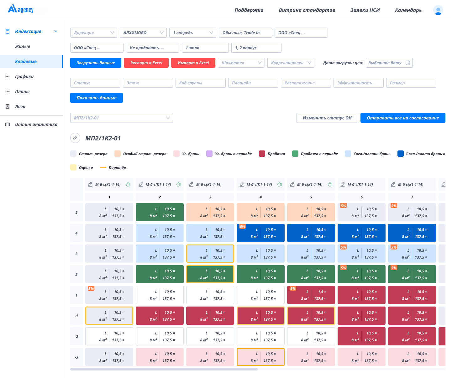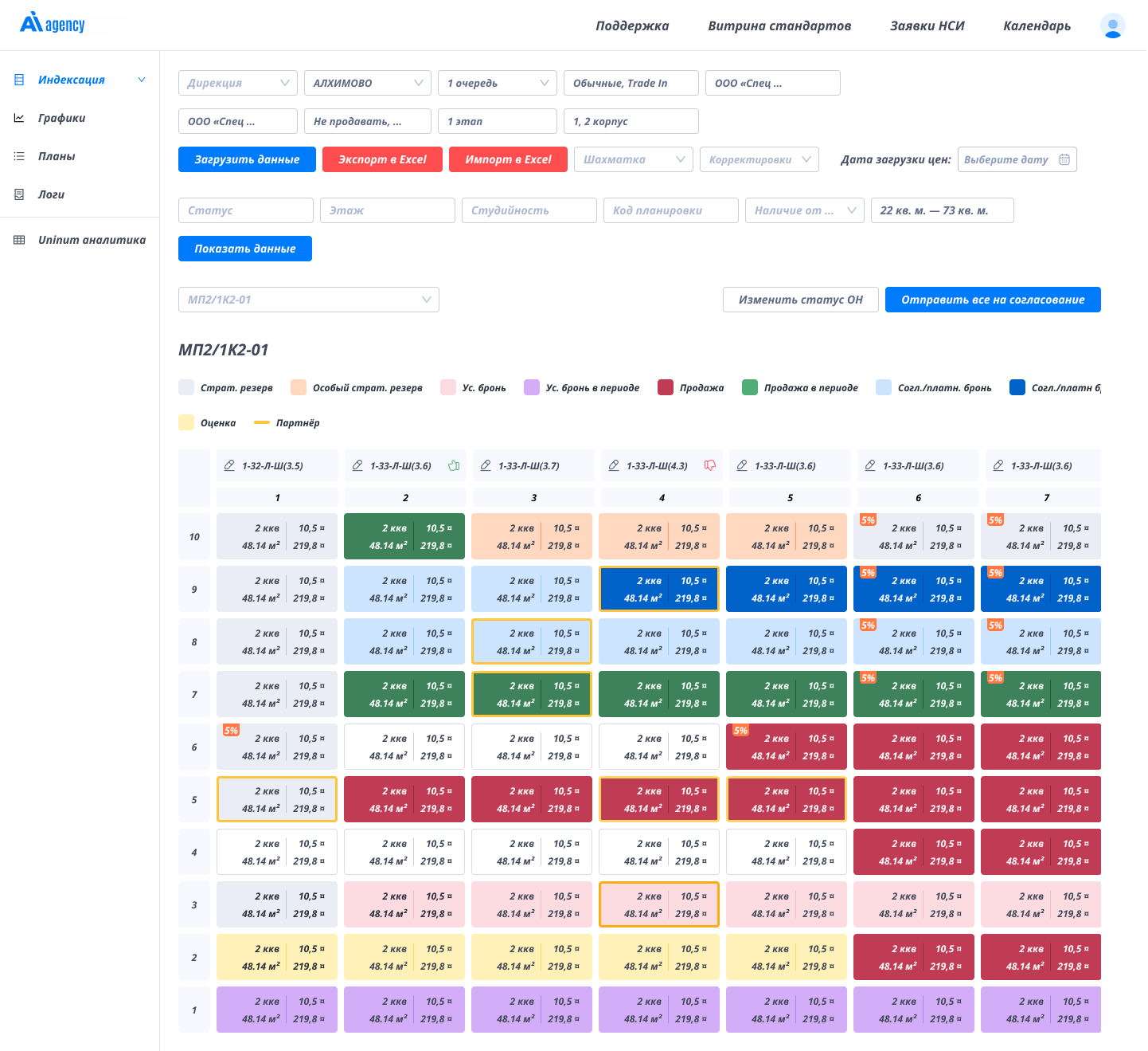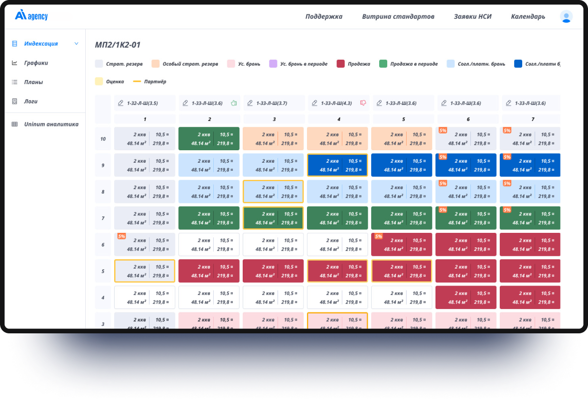 Адаптированное под внешний вид жилых корпусов представление объектов недвижимости обеспечивает детальный обзор отдельных планировок и секций. Это позволяет целостно оценить текущее состояние объектов и принимать обоснованные решения по корректировке цен.